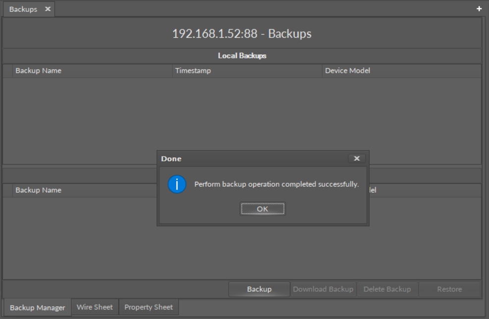Download Backup: downloads a backup to the PC and saves it under a selected name in the iSMA Tool’s default backup folder (home\backup\nano EDGE ENGINE); after downloading, the backup is displayed in the Local Backups section;