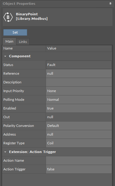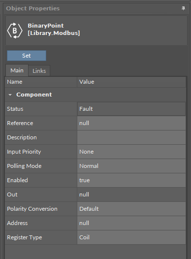 The BinaryPoint component is a network point class component, which allows to read and write Boolean values to a defined Modbus coil in the remote device.