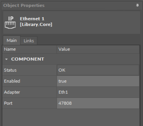 The Ethernet component allows to activate the BACnet IP or Modbus TCP/IP communication and to identify the port adapter and the number for the BACnet or Modbus network. The Ethernet component allows to identify the IP port number for BACnet or Modbus communication (by default, it is 47808 for BACnet IP and 502 for Modbus TCP/IP). It can be changed to any number from the slot's range (0-65535).
