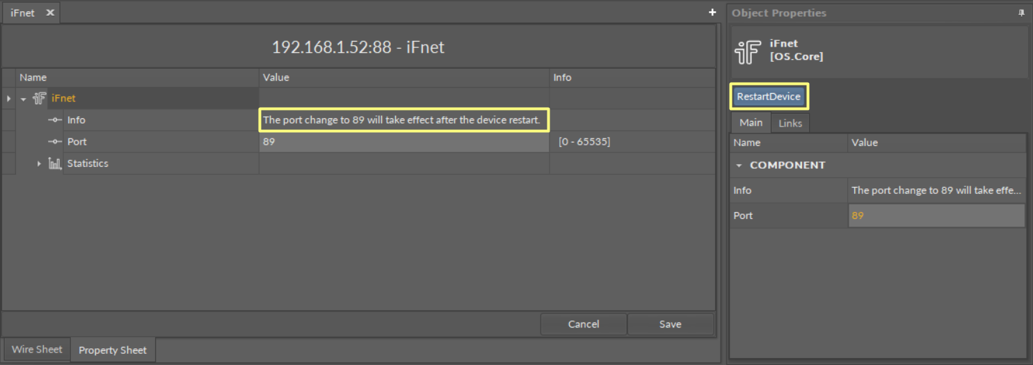 The iFnet port number can be changed by the user. Once the change is introduced, it requires saving and restarting the device. Before saving the component provides a notice: