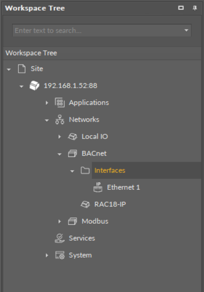 The Interfaces is a folder-type component. It is designed to contain components configuring BACnet or Modbus communication ports. Similarly like the BACnet or Modbus component, the Interfaces folder is automatically included in the device structure, and, by default, it contains the Ethernet or Serial component.