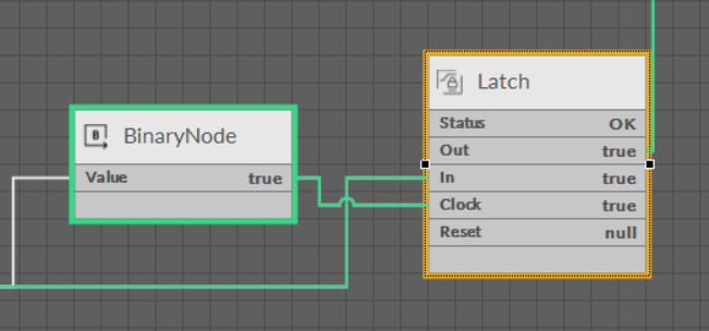 The Latch component temporarily latches the Out slot value based on the Clock slot value–if the Clock slot is set to true, the Out slot value is latched, regardless of changes to the In slot. The component has the Reset action, which brings the Clock slot value back to false.