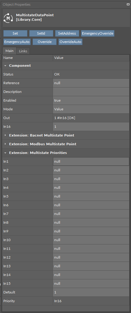 The MultistatePriorities extension adds fifteen writable input slots and the default (lowest) priority slot to the MultistateDataPoint. The extension includes the Priority slot indicating, which slot is transferring value to the Out slot. The AnalogPriorites extension adds In1–In15 slots and the Default slot, which is the lowest, 17th priority. The extension also introduces new actions to the Data Point: EmergencyOverride, EmergencyAuto, Override, and OverrideAuto.