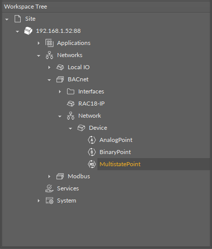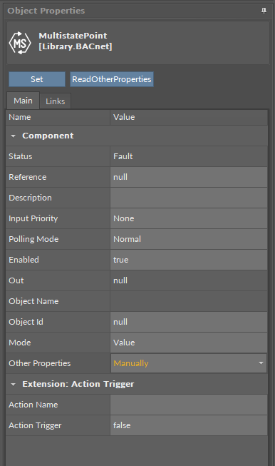 The MultistatePoint component is a network point class component, which allows to read and write analog integer positive values to a defined BACnet object in the remote device.