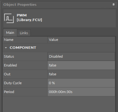 The PWM component implements a pulse-width modulation (PWM) mechanism. The PWM is based on two slots: Period slot: the time period of the cycle, and Duty Cycle slot: the value of the pulse width, expressed as percentage. The Duty Cycle slot defines the percentage of a time period (value from the Period slot), during which the Out slot is set to true. During the remaining period of time, Out slot will be set to “false”.