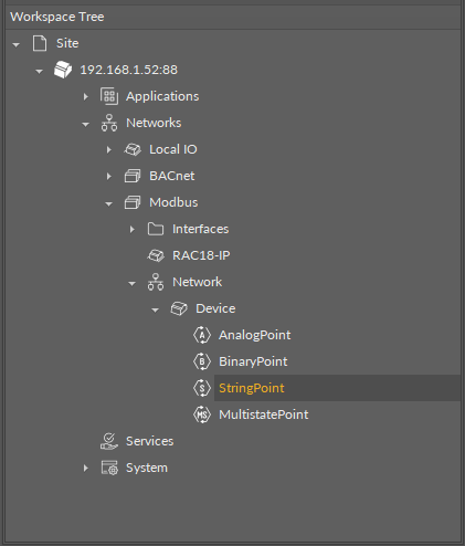 The StringPoint component is a network point class component, which is designed to work with the iSMA-B-LP room panel, and it allows to write values to registers displaying texts on the room panel's LCD display. The text sent to the room panel is defined in the StringPoint with the Set action, and it is always limited to 4 ASCII characters (any character entered over the 4th character is ignored and not displayed).