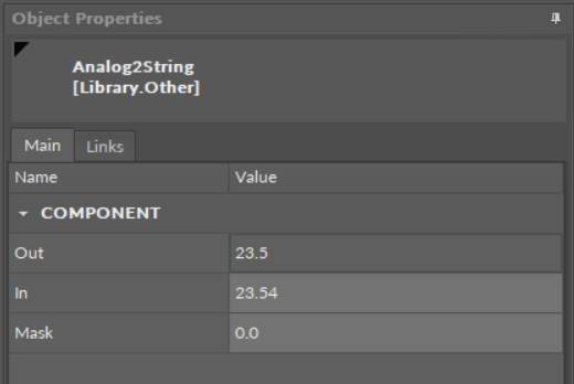 The Analog2String component takes a double value from the In slot (noted to two decimal places) and transfers it as a string value to the Out slot depending on the set mask value.