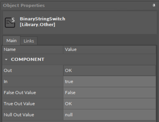 The BinaryStringSwitch component allows to set string values for binary true/false values. The component takes a binary value from the In slot and transfers a relevant string value to the Out slot. For example, if the In slot receives (or is set to) a true value and a string value for true is set to "On", the Out value is "On".