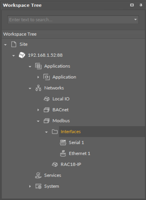 The Interfaces is a folder-type component. It is designed to contain components configuring BACnet or Modbus communication ports. Similarly like the BACnet or Modbus component, the Interfaces folder is automatically included in the device structure, and, by default, it contains the Ethernet or Serial component.