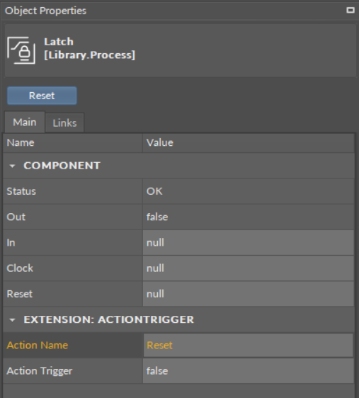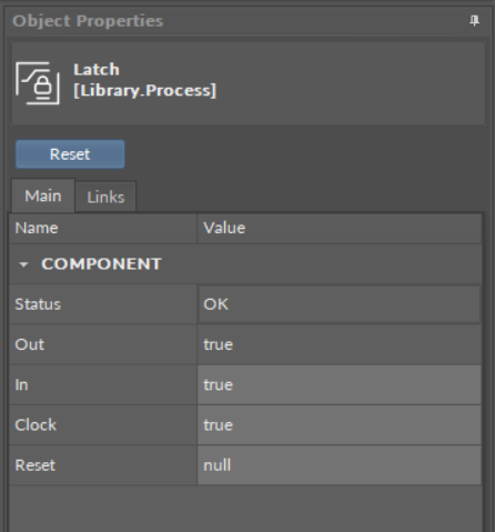 The Latch component temporarily latches the Out slot value based on the Clock slot value–if the Clock slot is set to true, the Out slot value is latched, regardless of changes to the In slot. The component has the Reset action, which brings the Clock slot value back to false.