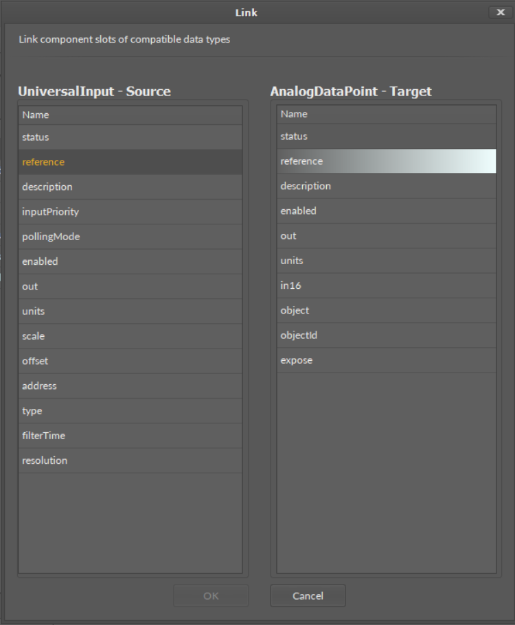The Reference link is a special compound link designed to connect Data Points with network points. The Reference link is created between special Reference slots and transfers values along with the component's status. Alternatively, it may transfer values between Data Points and network points at the same time returning status from network points to Data Points, or it may return values from network points to Data Points. As network points are situated in the Networks container and Data Points are situated in the Applications container, Reference links are created using the Link Mark and Link From options from the context menu, and they are created between the tabs (or, for example, between the Application tab and the network points expanded in the Workspace Tree window) or within the Workspace Tree window between Data Points in the Applications container and network points in the Networks container. Either way the Reference link between tabs is displayed in the Wire Sheet as a bubble connected to the component's Reference slot.