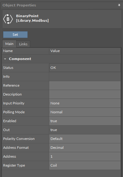 The BinaryPoint component is a network point class component, which allows to read and write Boolean values to a defined Modbus coil in the remote device.