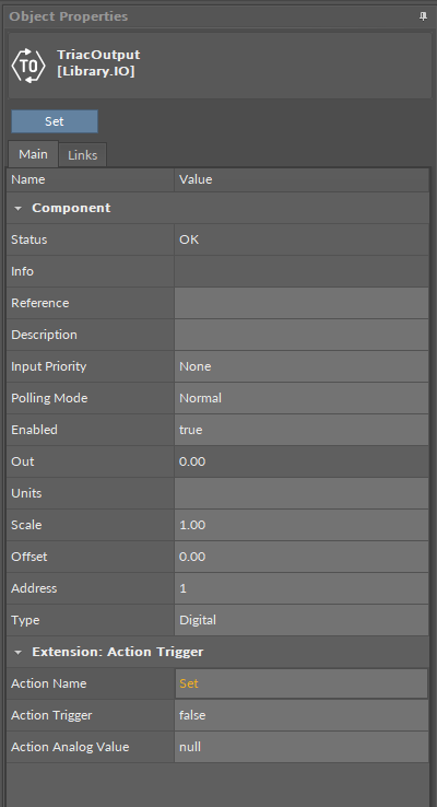 The TriacOutput component includes an action that allows to set its Out value in case no Data Point class component is linked to it.