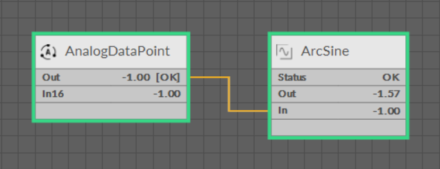 The ArcSine component returns an arcsine (an inverse sine function) value of the In slot.
