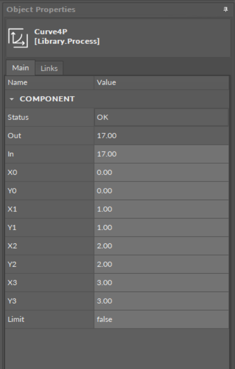 The Curve component performs a piecewise linearization according to intervals indicated by x1-xn values with y1-yn values assigned respectively. The Curve component reflects the mechanism of a heating curve. The In slot value is compared with x intervals, and the component estimates the Out slot value based upon the linear interpolation. The component has a Limit slot, which allows to limit the Out slot values to the interval between minimum and maximum y values.