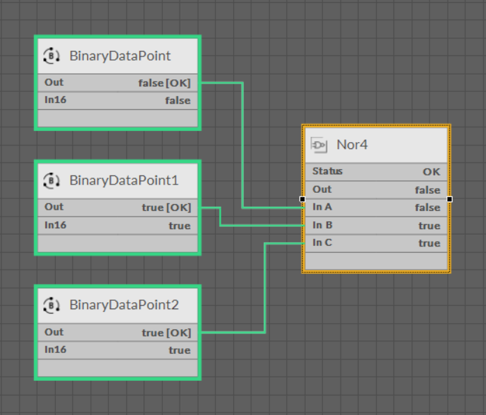 The Nor component performs a joint denial (a reversed disjunction)—the Out slot value is true if and only if all active input values are false; in case any of the In slots is true, the Out value is false.
