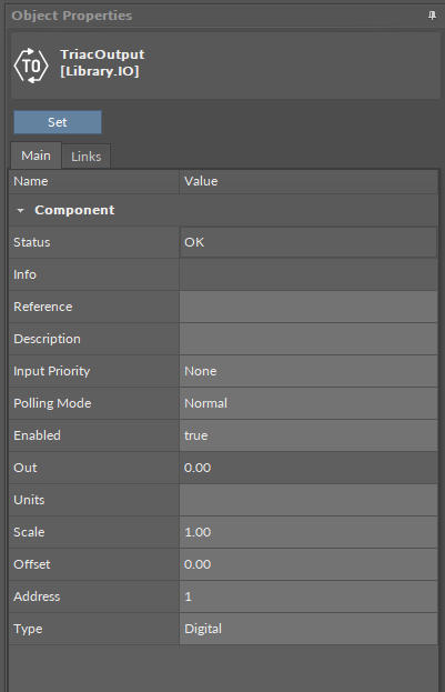 The TriacOutput component includes an action that allows to set its Out value in case no Data Point class component is linked to it.