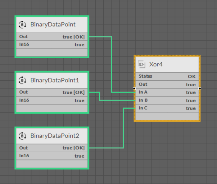 The Xor component performs an exclusive disjunction—the Out slot value is true if and only if the odd number of slots is true. If the even number of slots is true, the Out slot value is false.