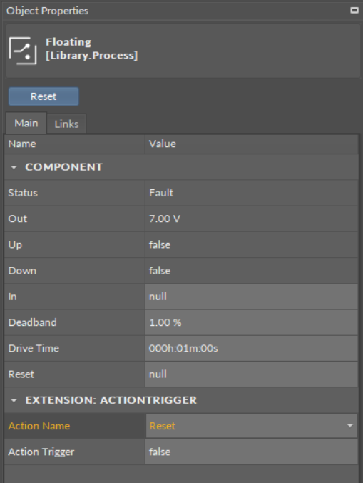 The ActionTrigger extension is designed to invoke any action that is available for the component. The extension triggers an action selected in the Action Name on the rising edge of the Action Trigger slot. If the action has parameters to set, the parameter is taken from a relevant slot automatically added to the extension (Analog Value/Binary Value/String Value).