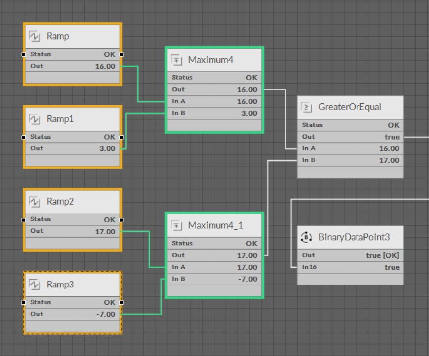 The Ramp component is designed for testing applications. It creates a sinusoidal signal with set amplitude and period. It provides an analog output value with a linear ramping out. The Out value continually changes, so the Ramp components is useful for simulation of changing conditions in application.