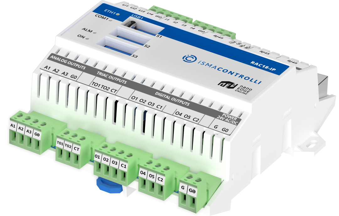 The RAC18-IP (Room Application Controller) is an advanced, freely programmable controller designed to comprehensively manage conditions of a small installation with universal user-programmed applications. The RAC18-IP is driven with the nano EDGE ENGINE, a fresh development from iSMA CONTROLLI–new software engine for the new generation of iSMA CONTROLLI controllers, launched with the Room Application Controller. The RAC18-IP controller allows very intuitive real-time programming of applications.