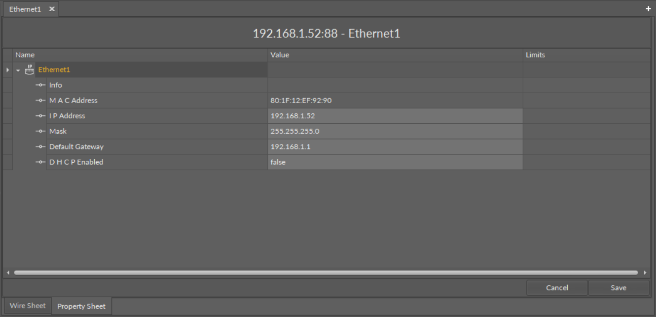 To enable the DHCP protocol, go to the Ethernet1 component in the System container, and set the DHCP Enabled slot to true.