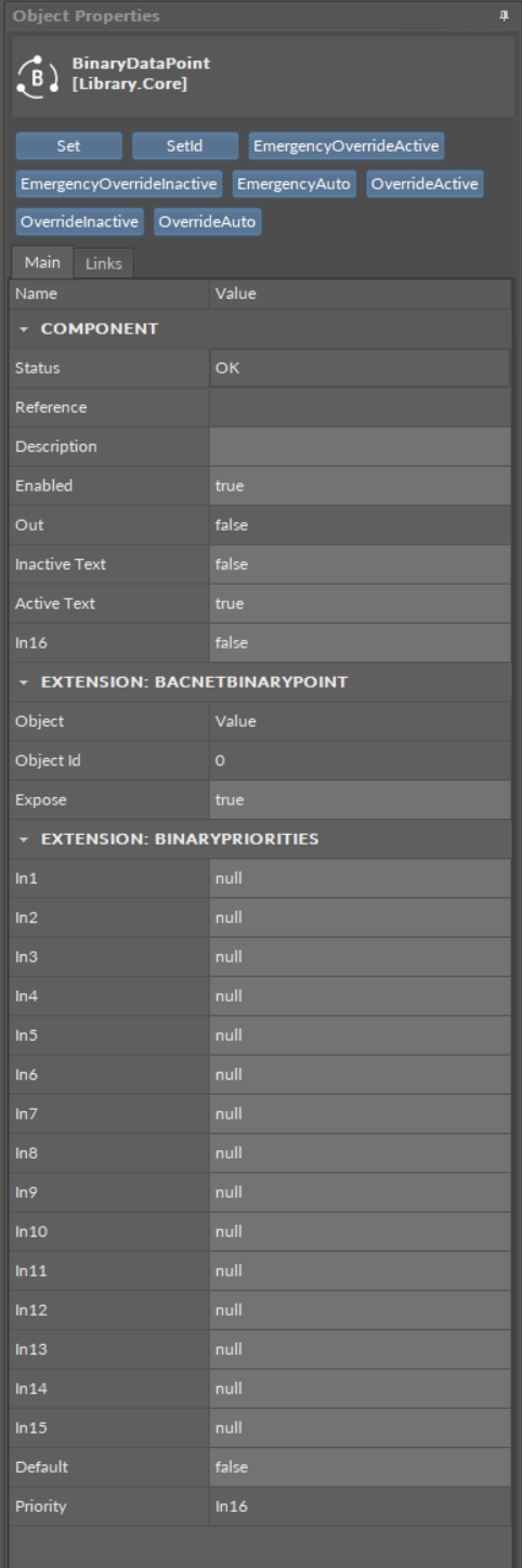 The BinaryPriorites extension adds In1–In15 slots and the Default slot, which is the lowest, 17th priority. The extension also introduces new actions to the Data Point: EmergencyOverride, EmergencyAuto, Override, and OverrideAuto. The BinaryPriorities extension adds fifteen writable input slots and the default priority slot to the Binary Data Point. The extension includes also the Priority slot indicating, which slot is transferring value to the Out slot.