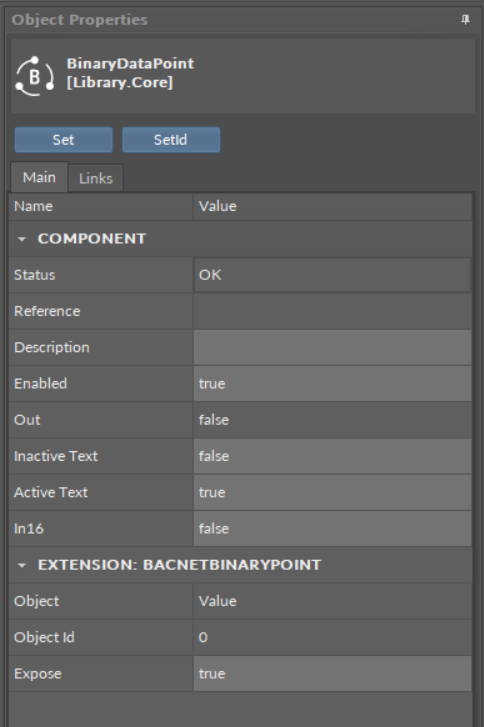 - SetId: sets a BACnet object Id of the Binary Data Point.