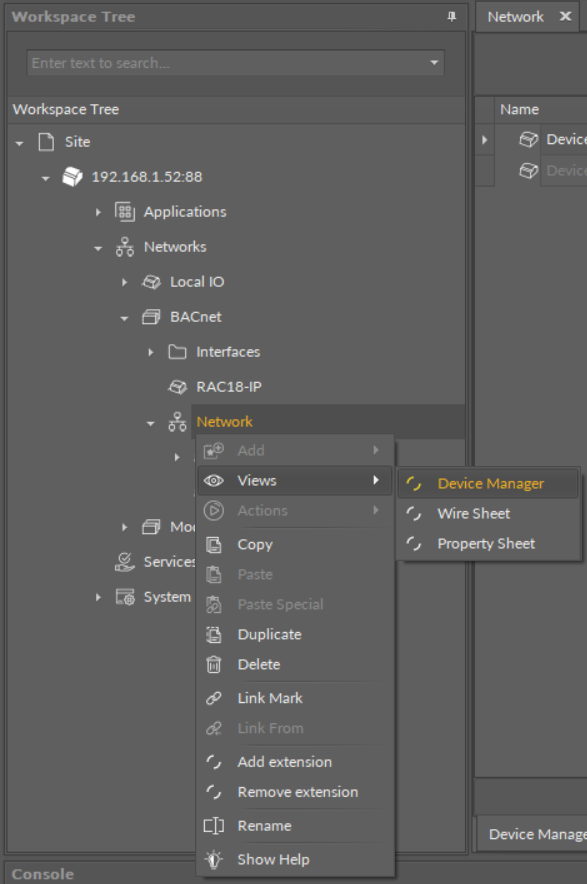 The Device Manager view is accessible from the context menu of the Network component. It is also automatically opened if the Network component is double-clicked in the Workspace Tree window.