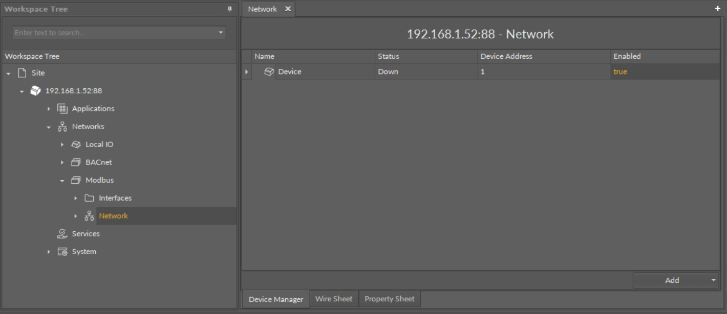 The Device Manager view is available for the Modbus Network component. It lists all devices added to the configured Modbus network. The Device Manager view shows the statuses, device addresses, and enabled or disabled states of the devices in the network. Once the device, listed in the Device Manager, is double clicked, the respective Device component is opened.