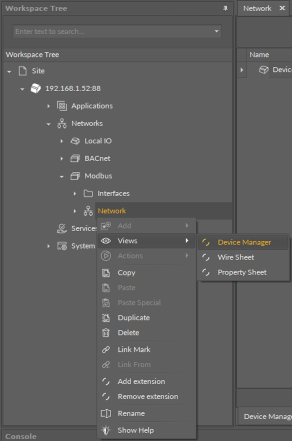 The Device Manager view is accessible from the context menu of the Network component. It is also automatically opened if the Network component is double-clicked in the Workspace Tree window.