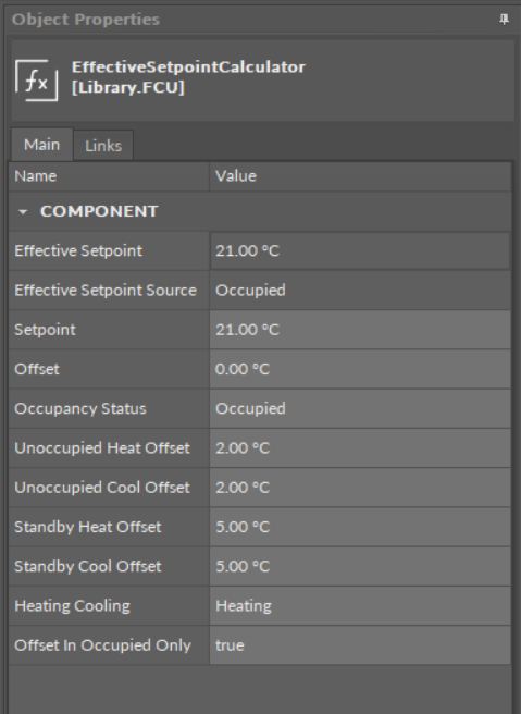 The EffectiveSetpointCalculator is a component, which calculates the value of the effective temperature setpoint, according to the setpoint value from the upper-level system (for example, BMS), offset of this value, occupancy mode, and the heating or cooling modes.