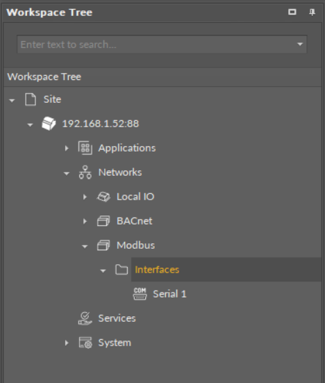 The Interfaces is a folder-type component. It is designed to contain components configuring BACnet or Modbus communication ports. Similarly like the BACnet or Modbus component, the Interfaces folder is automatically included in the device structure, and, by default, it contains the Ethernet or Serial component.