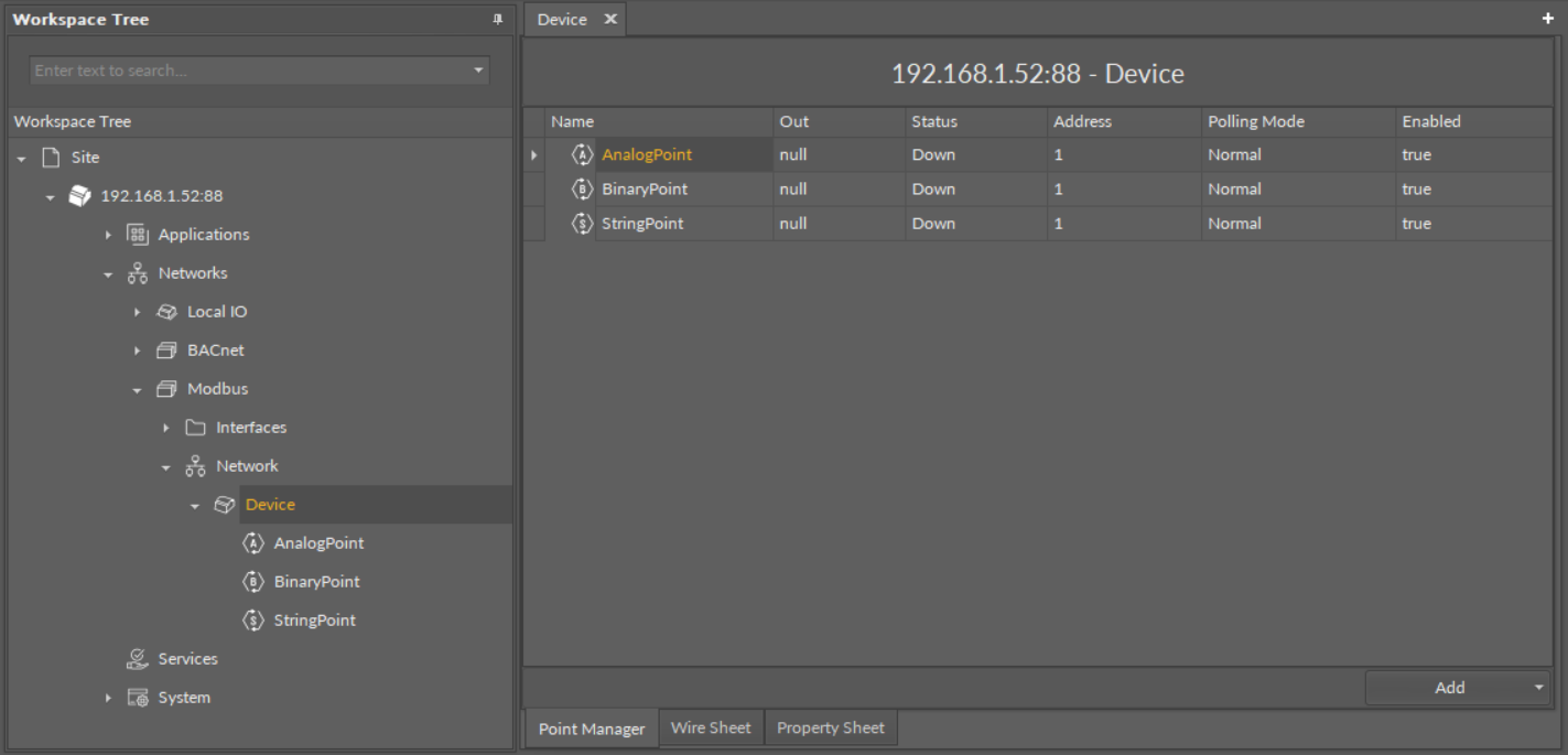 The Modbus points may be added to the device twofold: dragging and dropping the Modbus points to the Device component from the Modbus library (in the Device Libraries window), or using a special Add function in the Point Manager view available in the bottom right corner. The Add function allows to add any of the Modbus points available in the Modbus library.