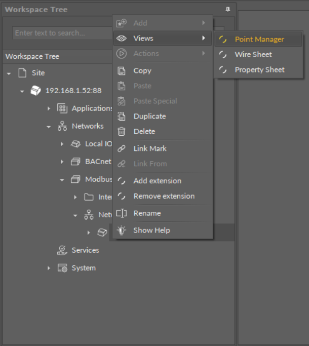 The Point Manager view is accessible from the context menu of the Device component. It is also automatically opened if the Device component is double-clicked in the Workspace Tree window.