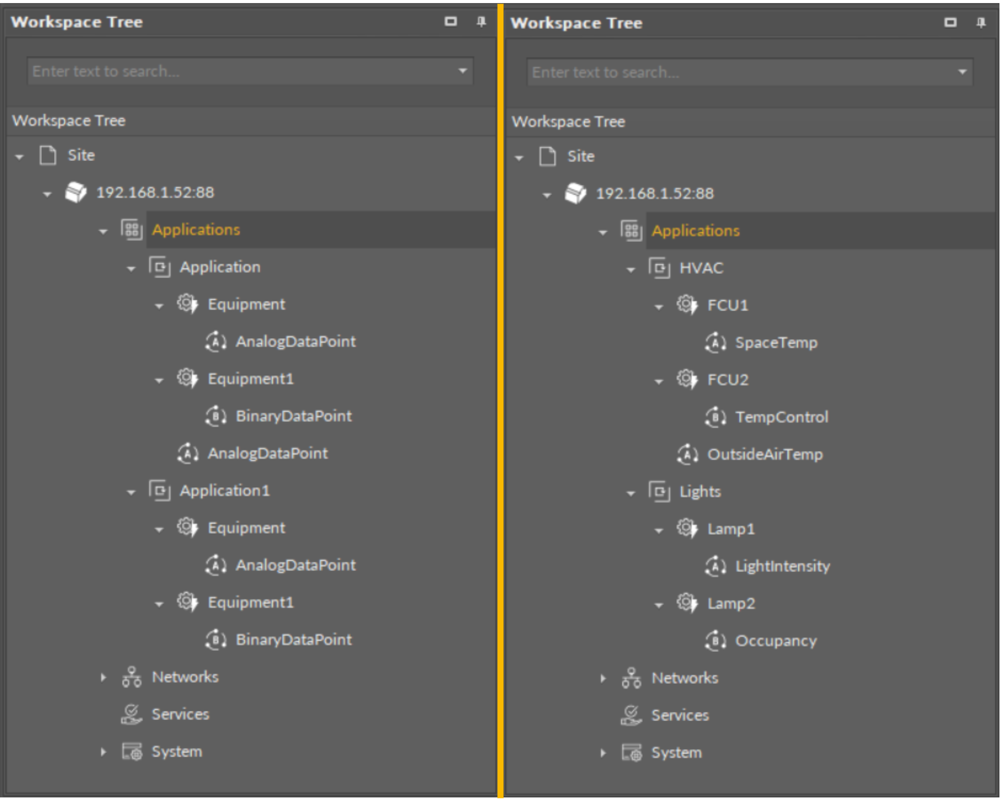 Step 5: (Recommended) Once all Application components are added to the Applications container, go to the Core library and add Equipment components for each item controlled by the application. Then add Data Points to the Equipment components. It is advised to rename components to fit the application characteristics.