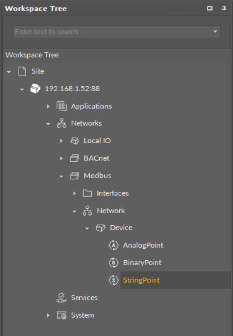 The StringPoint component is a network point class component, which is designed to work with the iSMA-B-LP room panel, and it allows to write values to registers displaying texts on the room panel's LCD display. The text sent to the room panel is defined in the StringPoint with the Set action, and it is always limited to 4 ASCII characters (any character entered over the 4th character is ignored and not displayed).