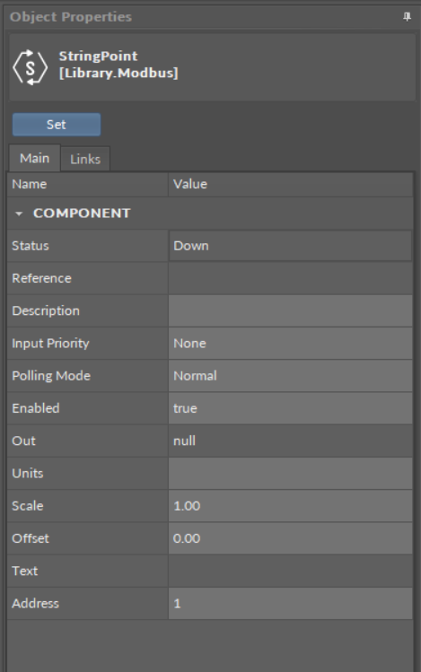 - Status: indicates the current status of the component; if the component works properly, its status is OK. The component becomes Disabled, once the Enabled slot is in false. The component's status is Fault, once the Address slot is null. If there is no response from the addressed point, the component goes into the Down status.