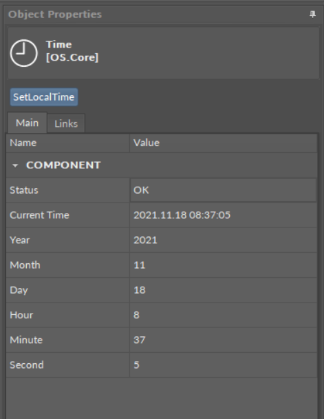 The Time component sets time and date in the device. In case the device is not powered longer than for a week, the time in the device is reset. The Time component allows to manually set local time in the device (with an action button) according to the computer's local time.