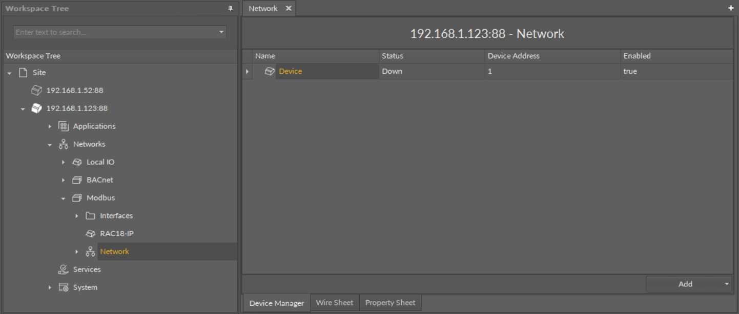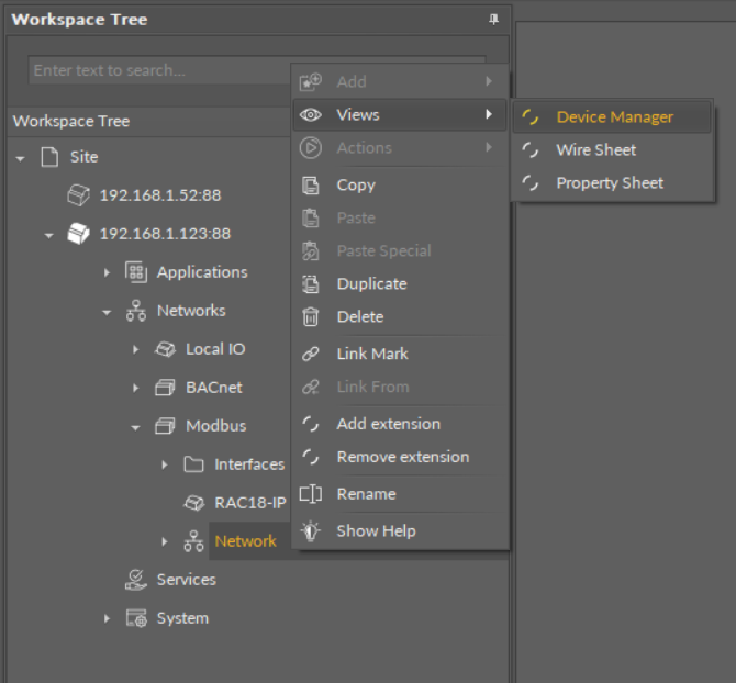 The Device Manager view is accessible from the context menu of the Network component. It is also automatically opened if the Network component is double-clicked in the Workspace Tree window.