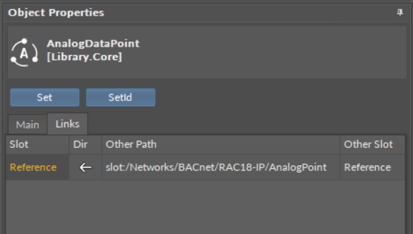 • As the Reference links connect elements from the Applications container (Data Points) and the Networks container (network points), in the Wire sheet they are displayed as bubbles: on the left side of the Reference slot for the input-type linking, and on the right side of the Reference slot for the output-type linking: