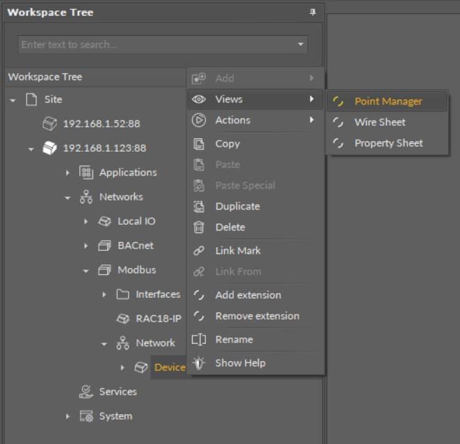 The Point Manager view is accessible from the context menu of the Device component. It is also automatically opened if the Device component is double-clicked in the Workspace Tree window.