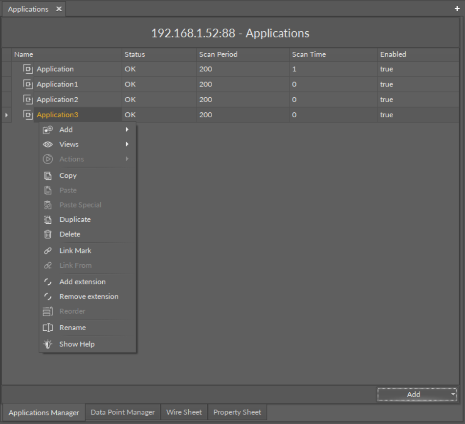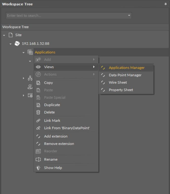 The Applications Manager view is also automatically opened if the Applications container is double-clicked in the Workspace Tree window.