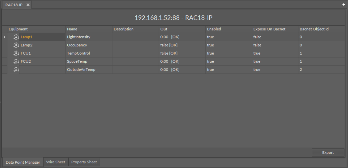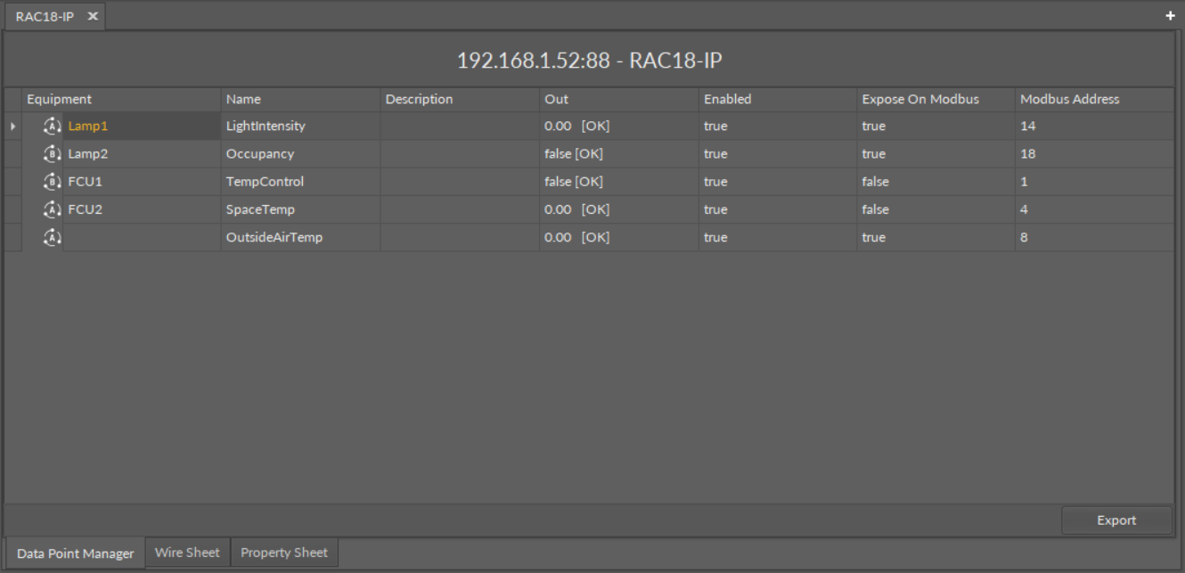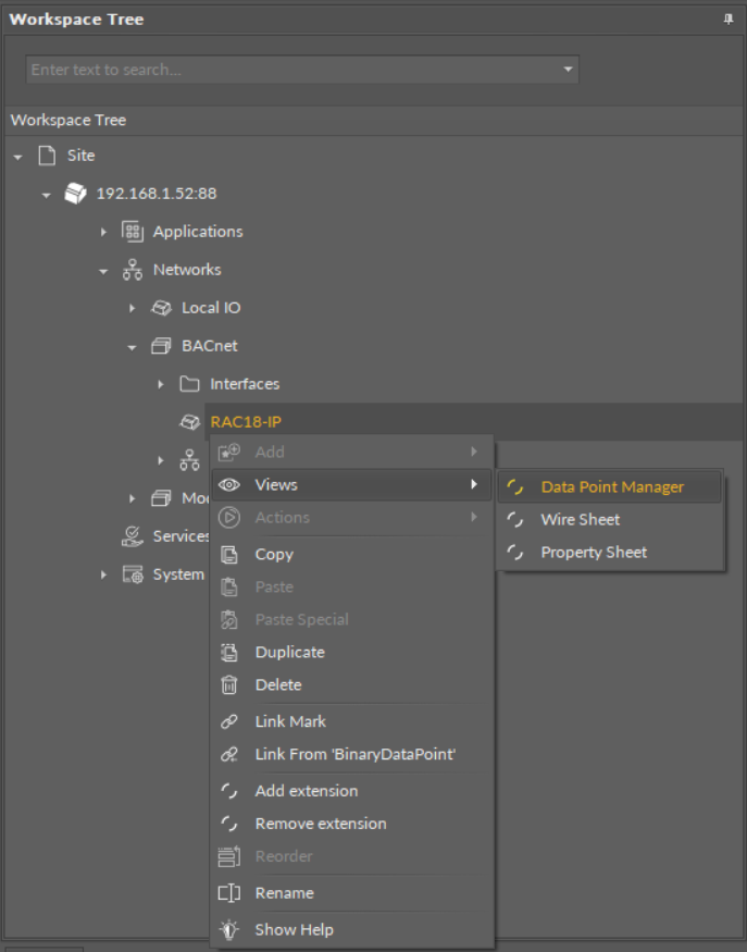 The Data Point Manager view is also automatically opened if either the Applications container or the RAC18-IP (Device for BACnet or Modbus) component is double-clicked in the Workspace Tree window.
