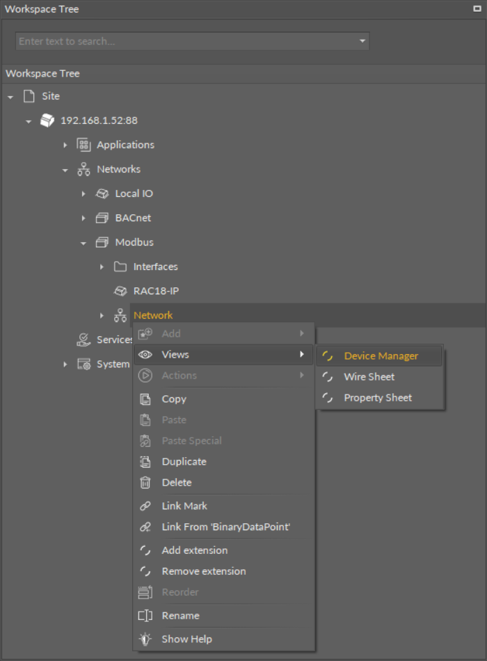 The Device Manager view is accessible from the context menu of the Network component. It is also automatically opened if the Network component is double-clicked in the Workspace Tree window.