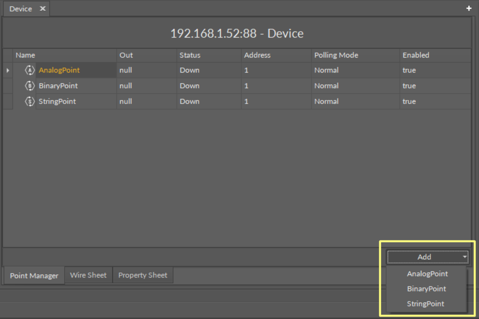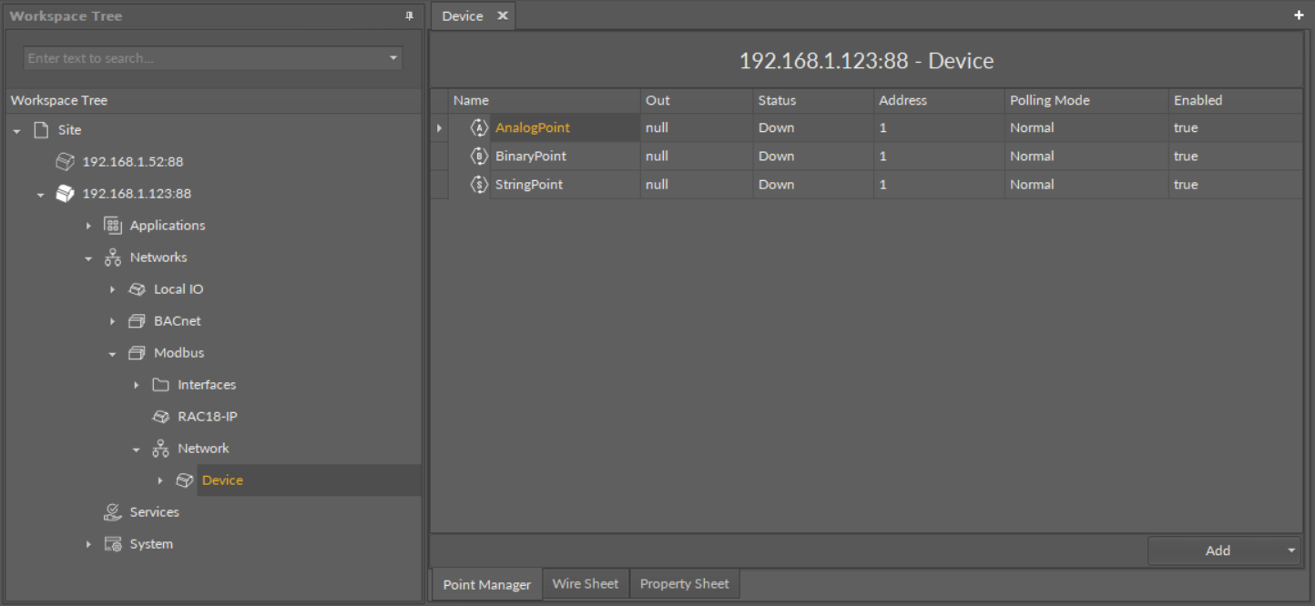 The Modbus points may be added to the device twofold: dragging and dropping the Modbus points to the Device component from the Modbus library (in the Device Libraries window), or using a special Add function in the Point Manager view available in the bottom right corner. The Add function allows to add any of the Modbus points available in the Modbus library.