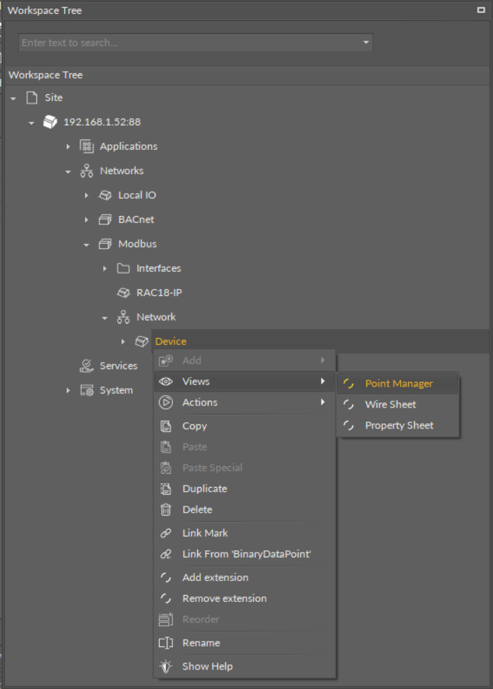 The Point Manager view is accessible from the context menu of the Device component. It is also automatically opened if the Device component is double-clicked in the Workspace Tree window.