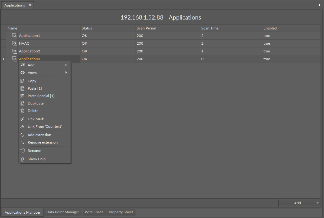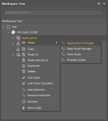 The Applications Manager view is also automatically opened if the Applications container is double-clicked in the Workspace Tree window.