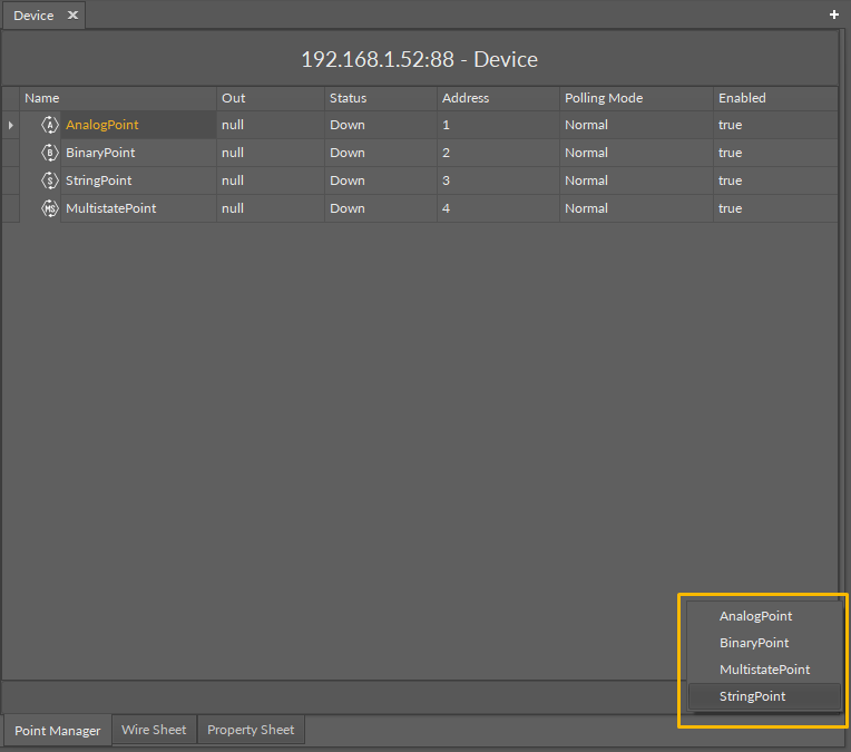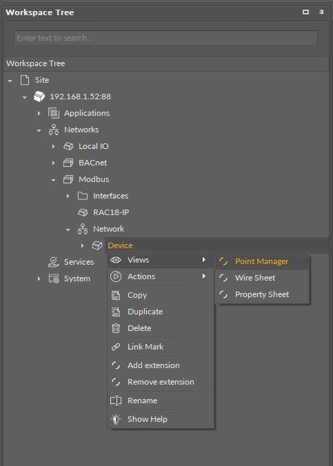 The Point Manager view is accessible from the context menu of the Device component. It is also automatically opened if the Device component is double-clicked in the Workspace Tree window.