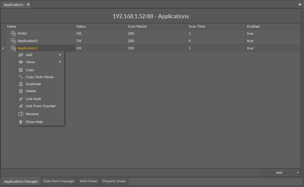 The Applications Manager view is accessible in the context menu of the Applications container.